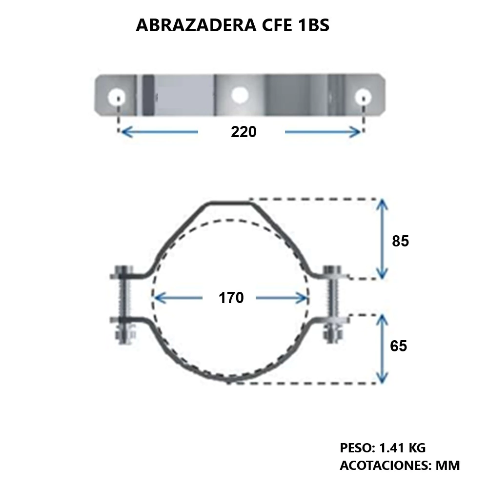 Abrazadera galvanizada por inmersión en caliente (NMX-H-004-SCFI-2020), fabricada con solera de acero A-36 de 1/4" x 1 1/2" doblada en frío (NMX-B-254-CANACERO-2008).