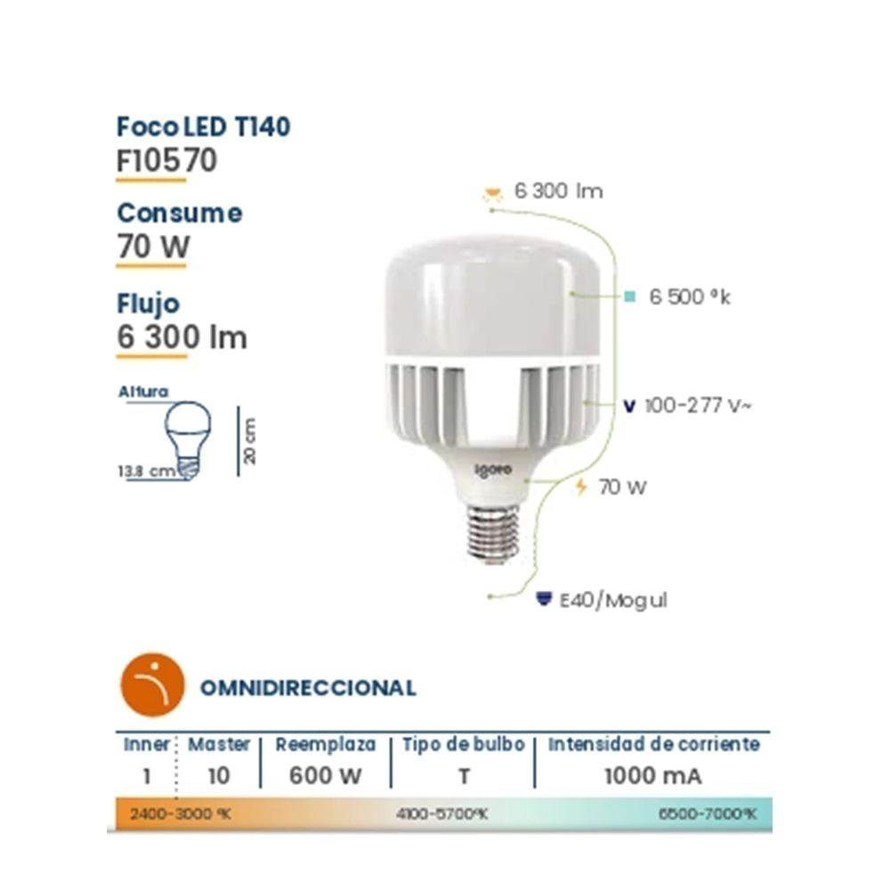Foco tecnología LED marca Igoto, ideal para distinguir los contrastes, mejorar las condiciones de visibilidad en el áreas al aire libre o amplias, tales como parques, calles, talleres, entre otros.