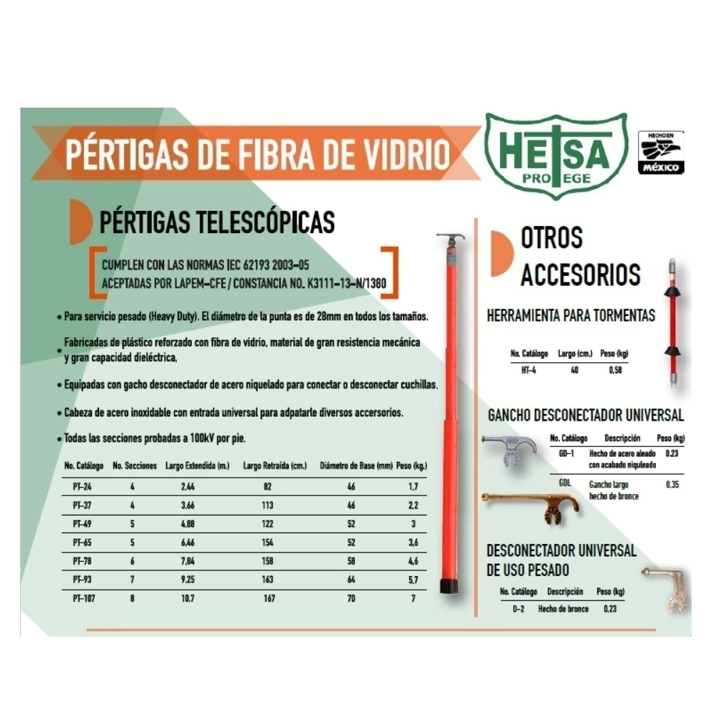 Las pértigas telescopicas de HETSA están fabricadas en fibra de vidrio, material de gran resistencia mecánica y altísima capacidad eléctrica, por lo son útiles en trabajos de baja y media tensión, principalmente en desconexiones y conexiones de cortacircuitos.